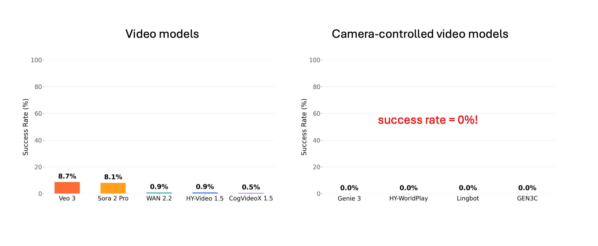 Perhaps unsurprisingly, these models largely fail to evolve the state as expected. The figure below shows the (very low) success rate of image-/text-to-video models (like Veo 3) and camera-controlled video models (like Genie 3). Both video generation models and camera-controlled video models struggle. In particular, camera-controlled models show an overall 0% success rate due to their strong bias toward static scenes.