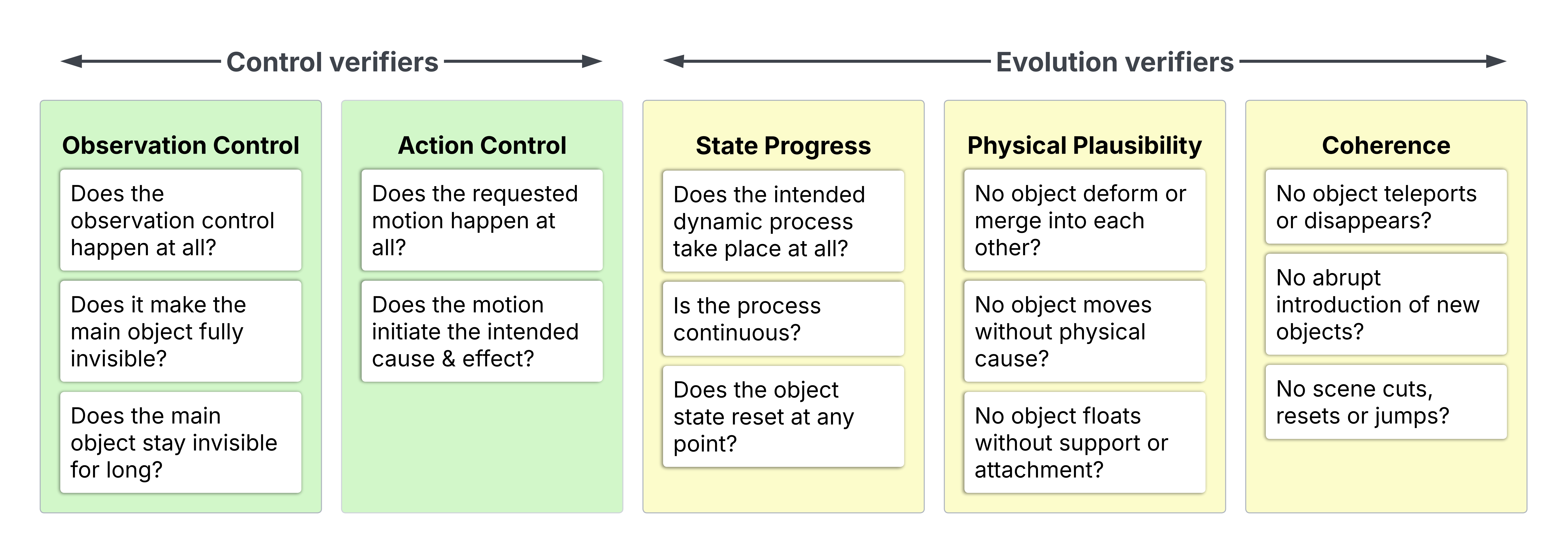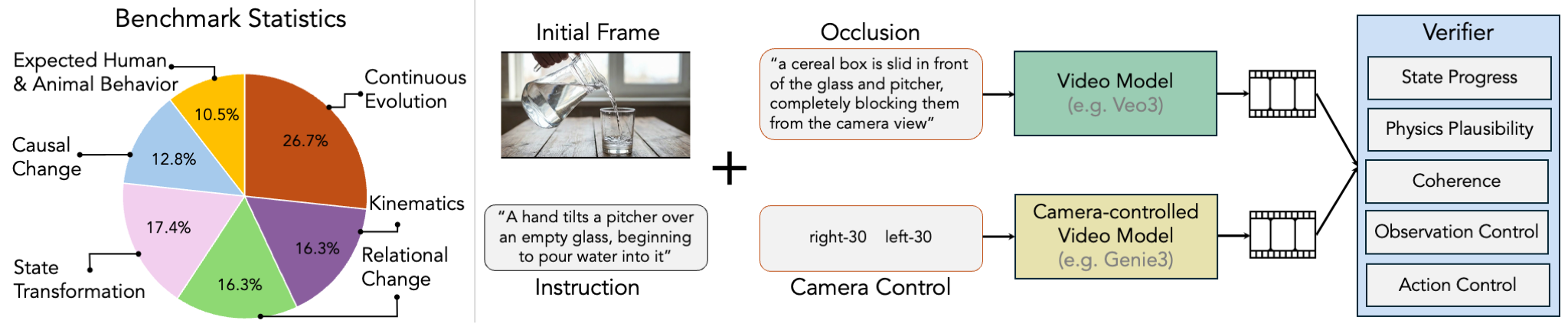 To quantify these various aspects, we build automatic VLM-based verifiers for each dimension, as detailed in Figure 3. In order to correctly evaluate evolution success under observation control, we only calculate state progress, physics plausibility and coherence on examples that correctly obey both action and observation control. To reduce control violations, we use the controls that are easiest for each model type: occlusion or “light off” for video models, and camera lookaway for camera-controlled models. More analysis can be found in our paper.