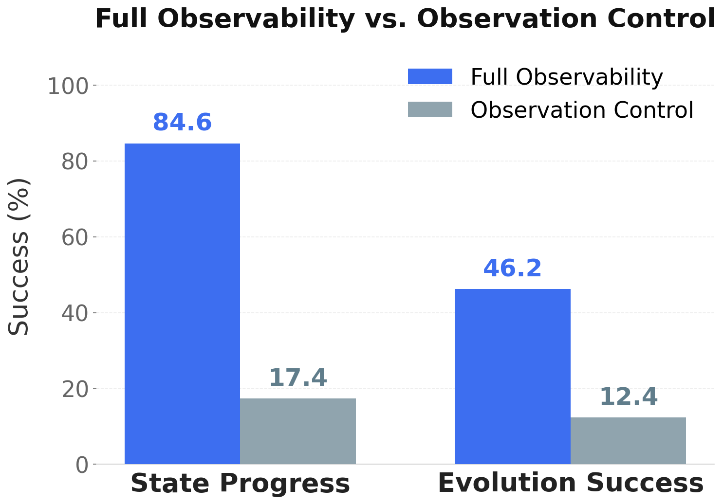 In general, when observation control is introduced, we observe a steep decrease in the overall state evolution success rate, as well as the state progress rate (which measures whether the state progresses at all, despite physical inaccuracies or artifacts). The figure below shows the contrast between the observation-controlled and the full-observability setting.